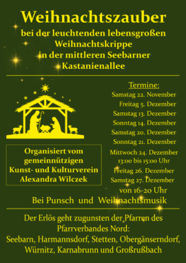 Der gemeinnützige Kunst- und Kulturverein Alexandra Wilczek brachte in diesem Winter weihnachtliche Atmosphäre in die mittlere Kastanienallee in Seebarn. Mit gemütlichen Getränken und einer beleuchteten, lebensgroßen Weihnachtskrippe schaffte der Verein einen besinnlichen Ort – perfekt, um in der Adventszeit innezuhalten und die festliche Stimmung zu genießen.
