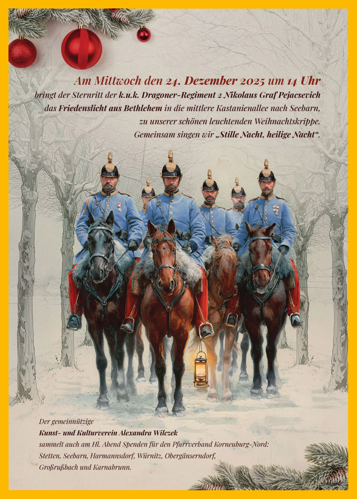 Sternritt der k.u.k. Dragoner-Regiment 2 Nikolaus Graf Pejacsevich bringt das Friedenslicht in die mittlere Kastanienallee nach Seebarn am 24.12.2025, 14 Uhr